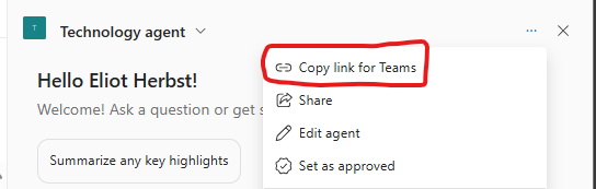 Currently, you can add custom-build SharePoint agent into a Microsoft Teams chat or channel by opening your agent, clicking the ellipsis, then selecting “Copy link for Teams”.
