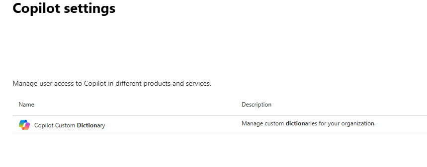 To upload a custom dictionary, go to the M365 Admin Center -> Copilot -> Settings -> View All, then find Copilot Custom Dictionary.